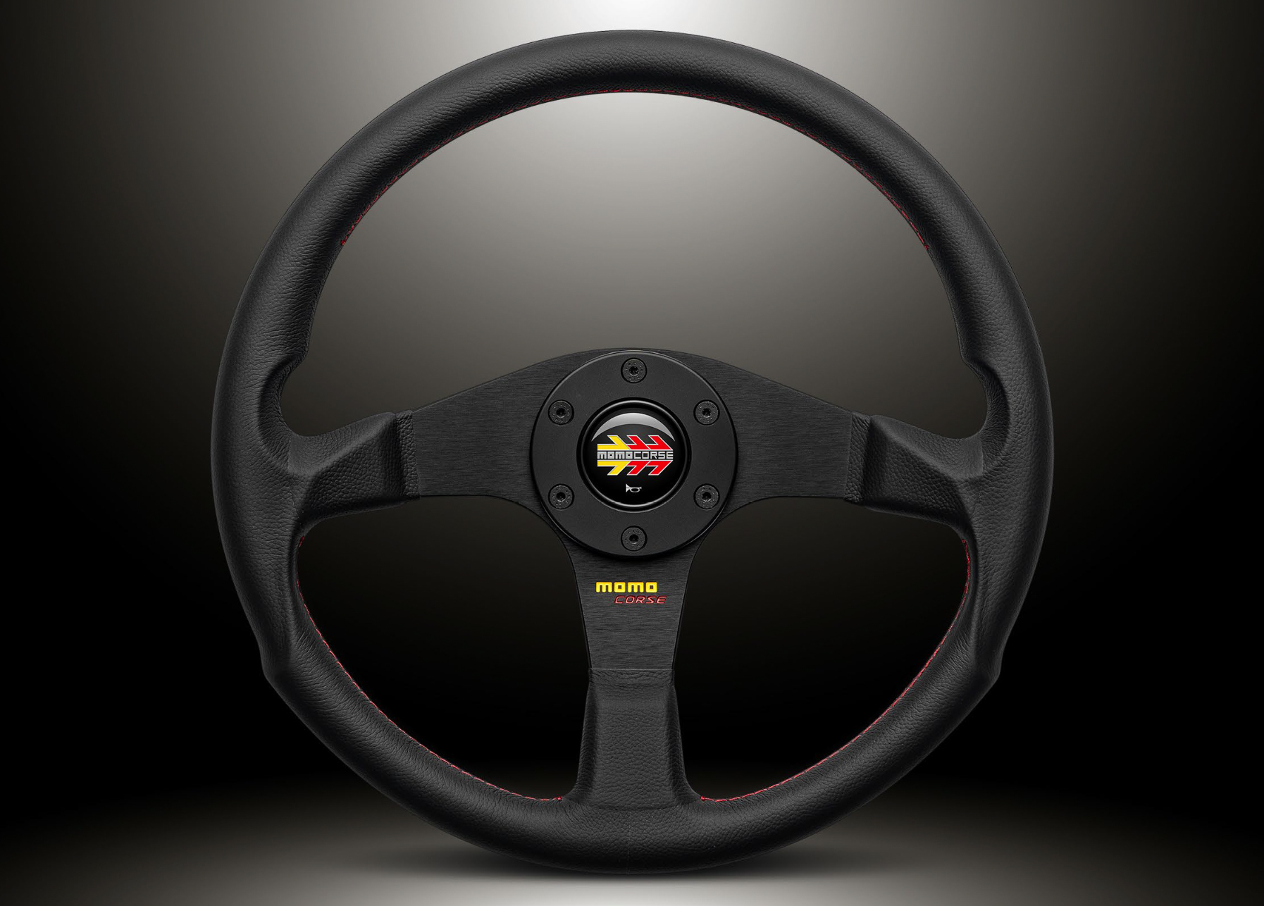 - Central aluminum ring and exclusive horn button with historical MOMO CORSE logo.